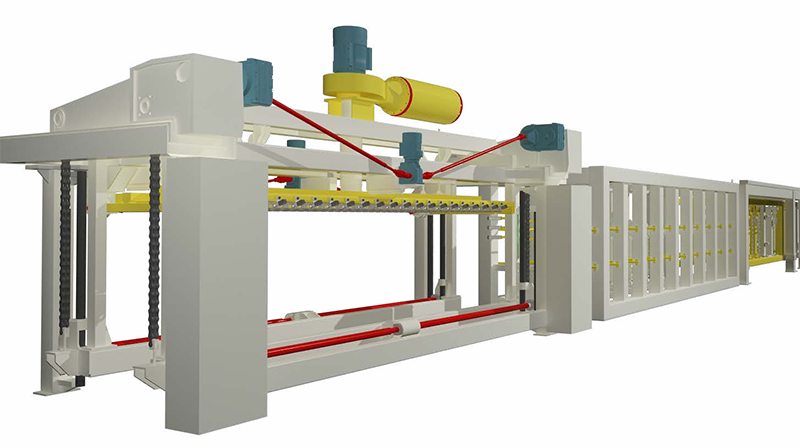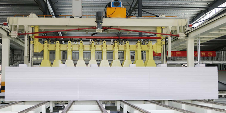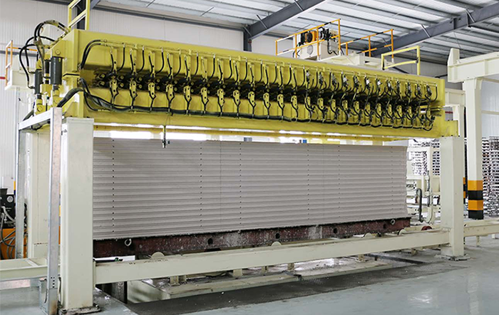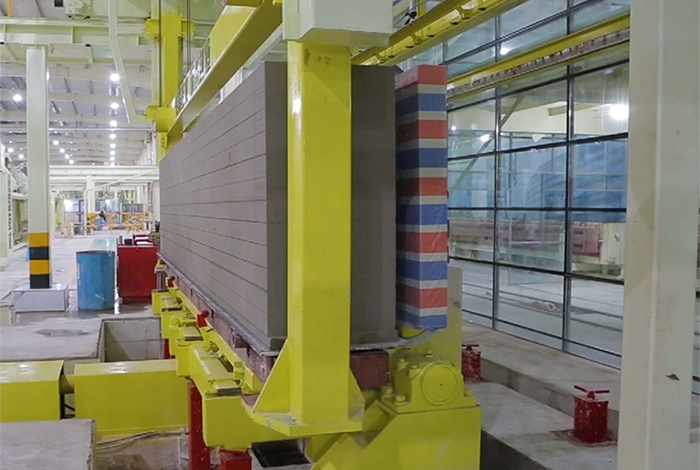 切割機組是加氣板材生產(chǎn)線的核心設(shè)備,用于切割不同尺寸的坯體,滿足超精確砌塊和板材的切割精度要求,生產(chǎn)板材時配合板材進(jìn)給刮刀,調(diào)節(jié)側(cè)面切割機的刮刀行程,可以滿足不同尺寸制品的混合切割。